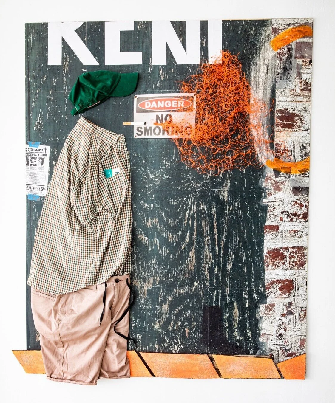 Drawing from the many identities she carries as a Mexican-American-Puerto-Rican-queer woman, Estelle Maisonett creates large-scale mixed-media collages that explore how identity is fabricated through our choices as consumers. Maisonett traverses the urban landscapes of New York City, collecting our detritus and archiving her findings. Making use of the city's refuse—old clothes, crushed cans, magazine covers, protest signs—she recreates the domestic spaces and neighborhood hangouts of her native New York and populates these scenes with faceless figures. Without a body, how do we interpret these all-too-common leftovers of an American metropolis? Who are these individuals? And why do we identify them as such? Asking these questions, Maisonett's work highlights our limited perceptions of identity and the continued influence of American capitalism on our collective subconsciousness.